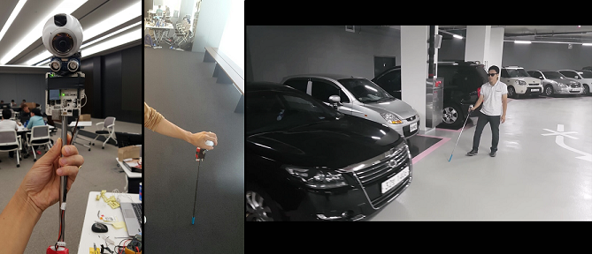 예를 들면, '앞에 자동차가 있다', '앞에 사람들이 지나가고 있다', '앞에 아름다운 꽃이 있다' 등과 같이 앞에 펼쳐진 광경을 최대한 음성으로 자세히 설명할 수 있도록 하였습니다.